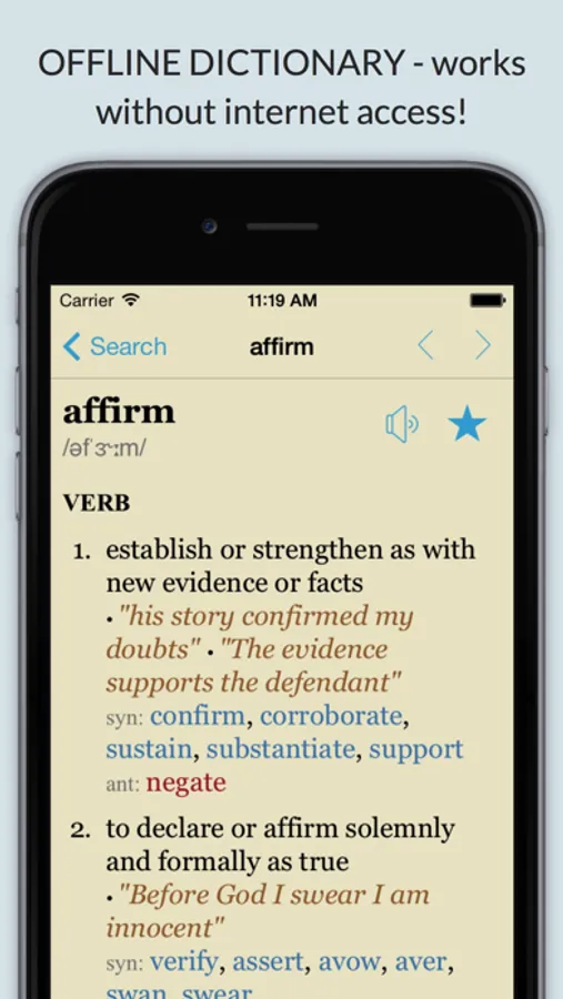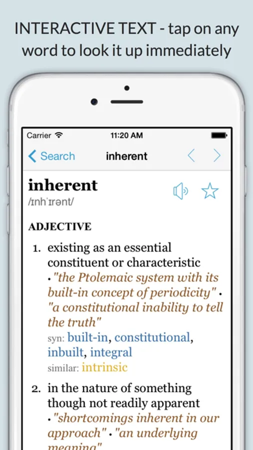 • LARGE DATABASE - more than 150.000 words with definition, pronunciation, example sentences, synonyms, antonyms and similar words.
