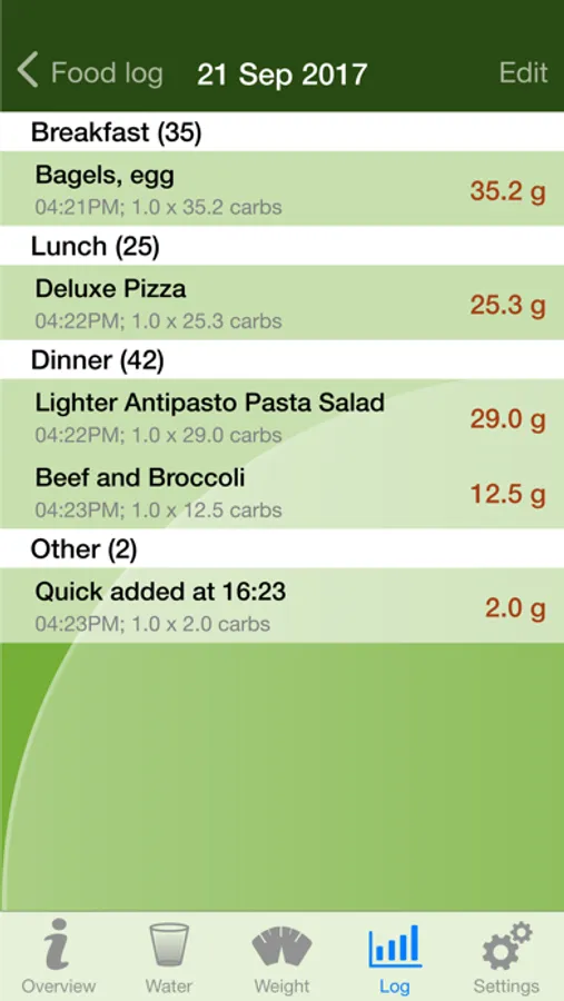 View Net carbs count for each day