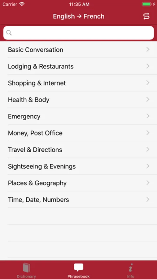 Phrase categories include basic conversation, lodging and restaurants, emergency and survival, time, date, and number vocabulary, sightseeing and nightlife, shopping, transportation, and more.