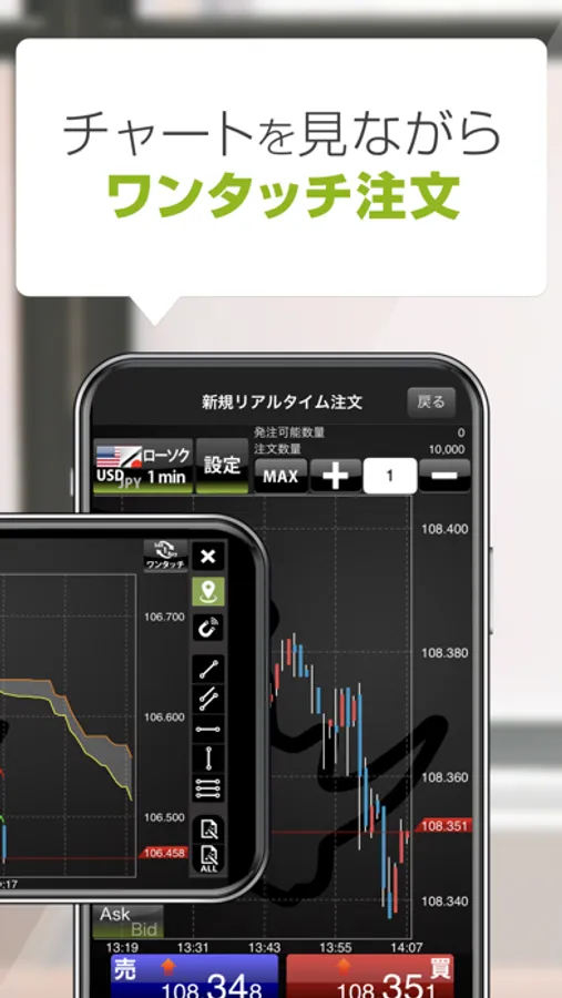 また、リアルタイムで相場や口座状況を確認しながらワンタップで注文できる「ワンタッチ注文」を始めとした充実の注文機能を備えており、