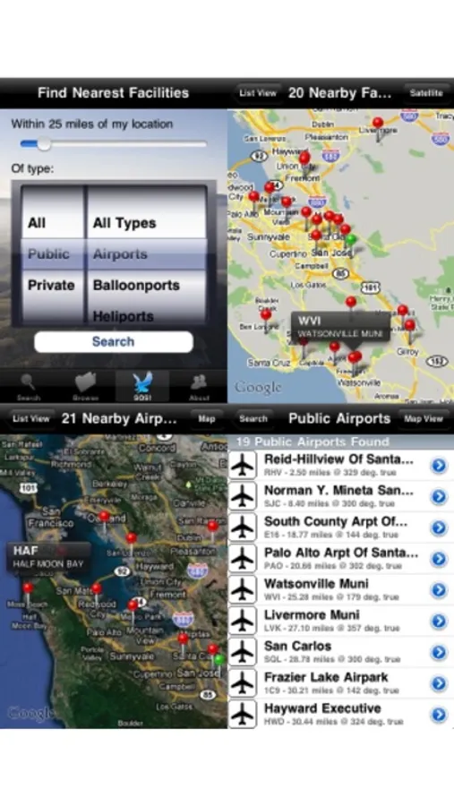 Having aircraft engine trouble? Running low on fuel? No more crash-landing in the parking lot! Airports-4-Pilots will dynamically provide you with a list of the closest landing facilities, public and private, sorted by distance to your present location, and will give also you directions to each located facility, as well as provide a map and comprehensive information on your chosen landing spot.