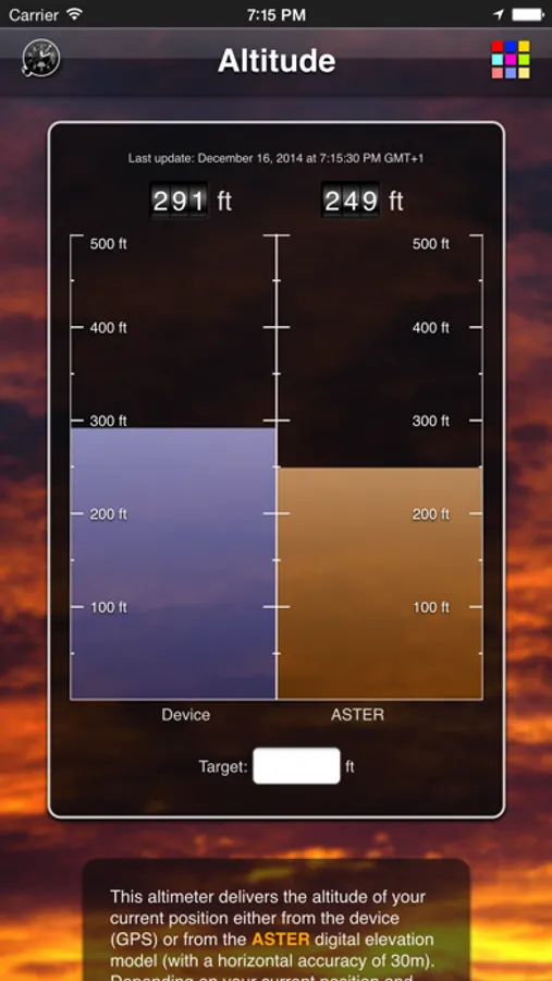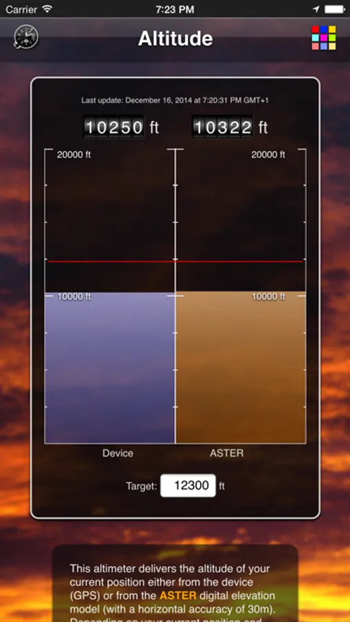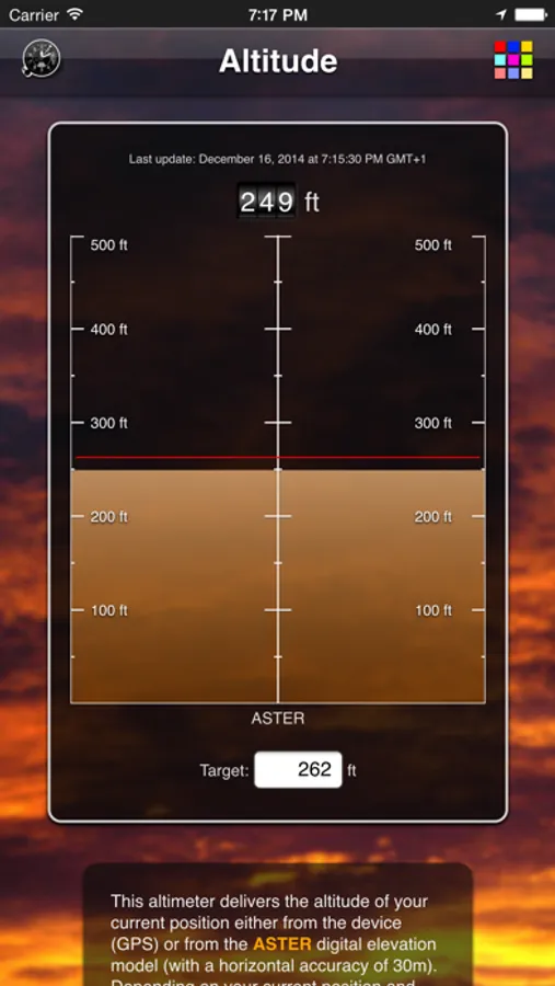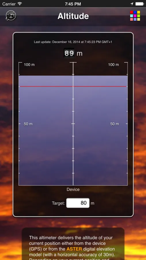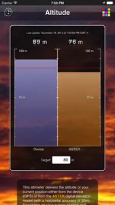 This altimeter delivers the altitude of your current position either from the device (GPS) or from the ASTER digital elevation model (with a horizontal accuracy of 30m).