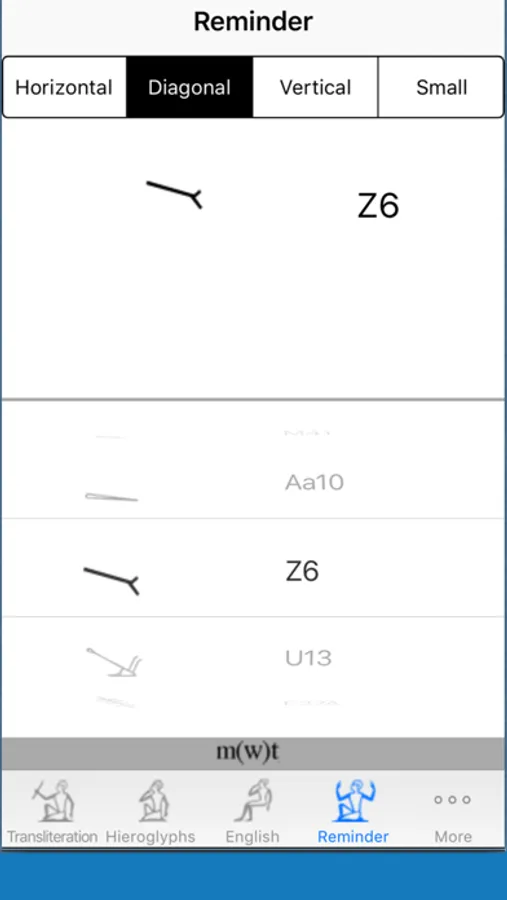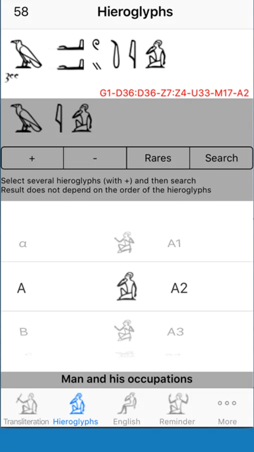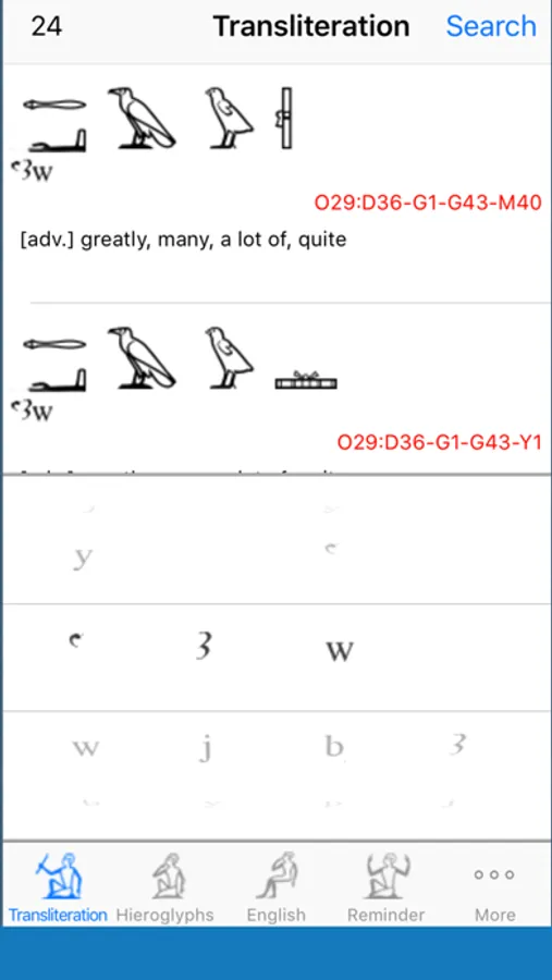 You can search by hieroglyphs, transliteration or translation. The number of matching words is displayed on the screen top left. To avoid too many words, it is recommended to select at least 2 hieroglyphs or 2 transliteration letters.