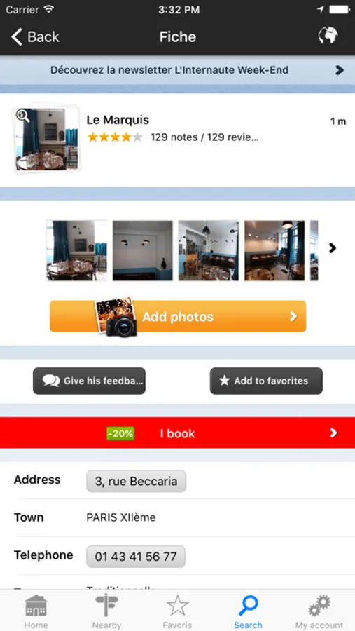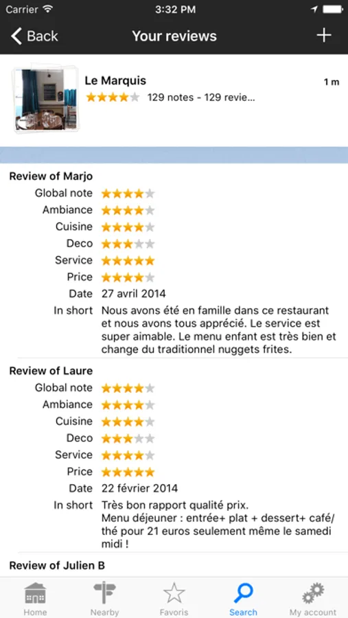 - As soon as your meal is over, you can add a review of a restaurant : cuisine, decoration, ambiance, service, price... Give your opinion and read other users opinions.