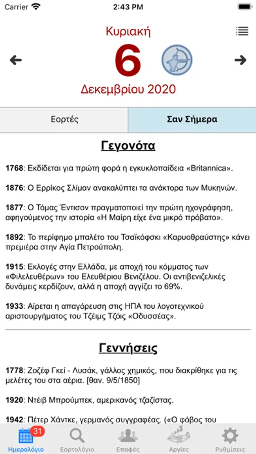 Υπάρχει η δυνατότητα εισαγωγής από το χρήστη γεγονότων ανά ημερομηνία (εμφανίζονται με ετήσια περιοδικότητα)