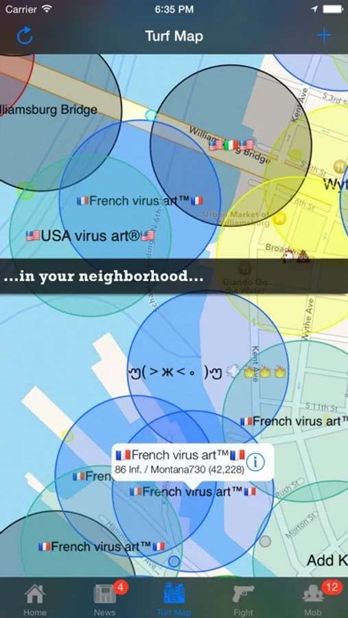 Turf Wars is the massively multiplayer online game where you claim and defend your favorite real-world places from other mobsters. Stake your claim on your neighborhood, your favorite bar or restaurant, your school or workplace – the city is yours for the taking!