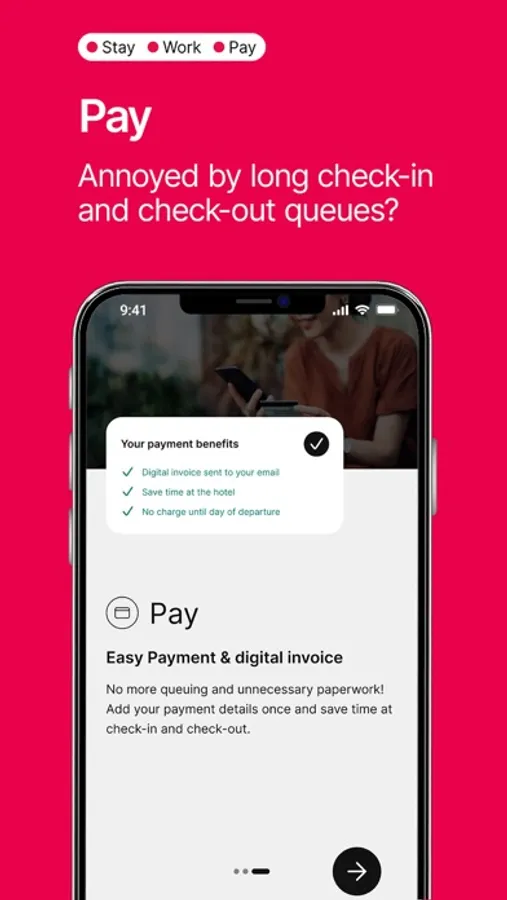 PAY: Skip the long queues at check-in and check-out! Add your payment details once and save time. You’ll also receive a digital invoice.