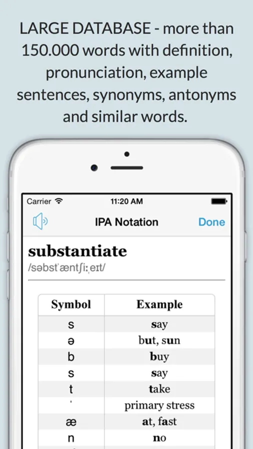 • LARGE DATABASE - more than 150.000 words with definition, pronunciation, example sentences, synonyms, antonyms and similar words.