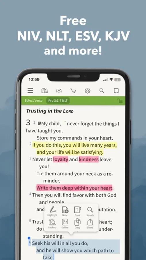You can highlight and save your favorite passages, drop a book ribbon, create a note, add tags, and sign up to receive a daily Bible verse. Your highlights, notes, and resources sync between all your devices.