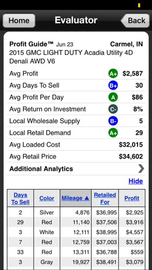 Local Market Performance – Autoniq’s exclusive Profit Guide helps you determine which vehicles are selling the fastest in your local market at the highest profit? It's not a pricing guide but a Profit Guide and delivers detailed local market information including Sale Price, Cost and Days to Sell information by vehicle. You can also sort and examine individual transaction. Data that is updated weekly from over 13,000 J.D. PIN (Power Information Network) dealership franchisees in the US. Autoniq is your single source for real profitability insight on vehicles in your local market.