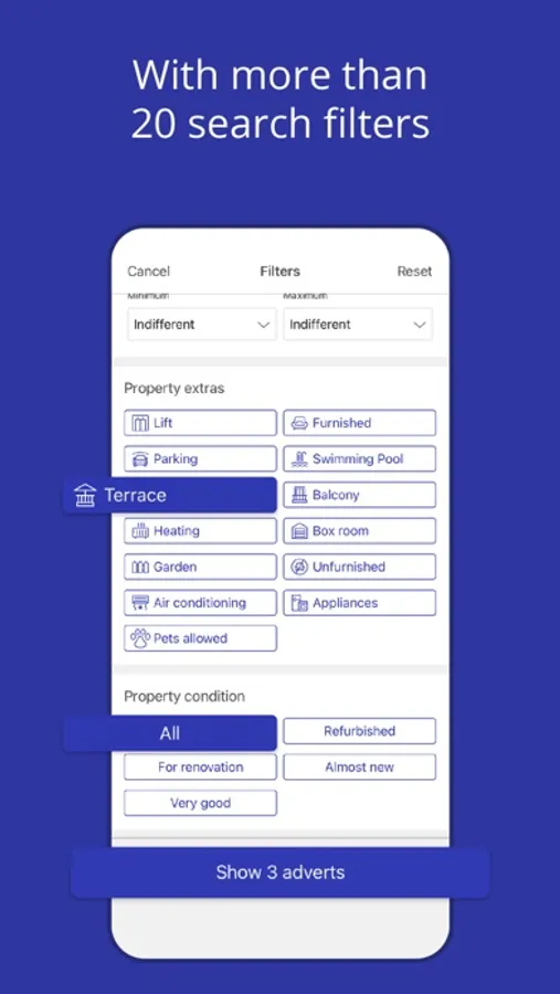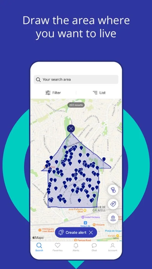 You can search by province, municipality, neighbourhood, points of interest or proximity to your current location, you can even draw on the map the exact area where you want to find properties. The results will appear in the form of a list or on a map, from which you can see all the available properties.