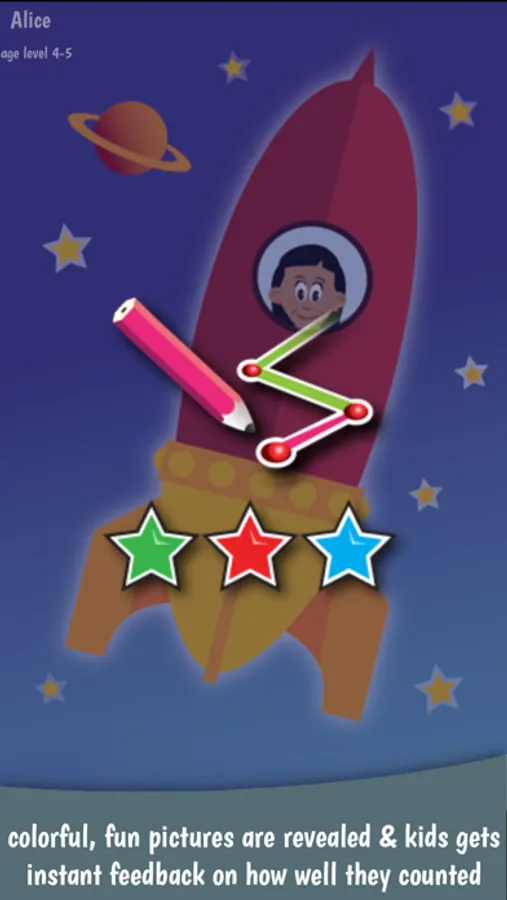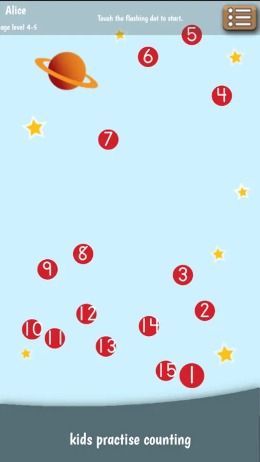 Choose what kids practice or use the app’s age-based settings. A four year old might practise counting “1,2,3” through simple dot-to-dot number puzzles, especially designed for younger fingers. If they touch the right dot, the app says the number next to it. If they touch the wrong dot, the dot wriggles to let them know and the correct dot starts to flash.