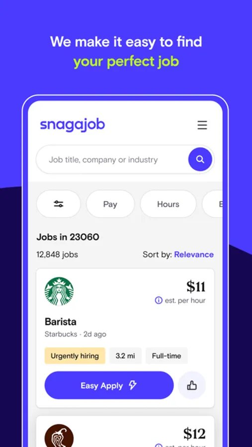 Snagajob is the #1 free, easy job finder app to find part-time jobs and full-time jobs, make job applications easier, get great career advice and more. Great for students, teens or anyone who needs flexible hours. Plus, Snagajob is better than Indeed, Monster or ZipRecruiter because we only have hourly jobs, so it makes your job search easier.