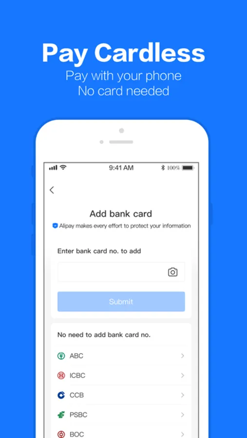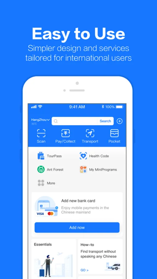 Foreign visitors to China can connect their credit card to take advantage of Alipay’s widespread acceptance by tens of millions of merchants across the country. Alipay is not designed or intended for use by foreign users in their home country or anywhere outside of China.