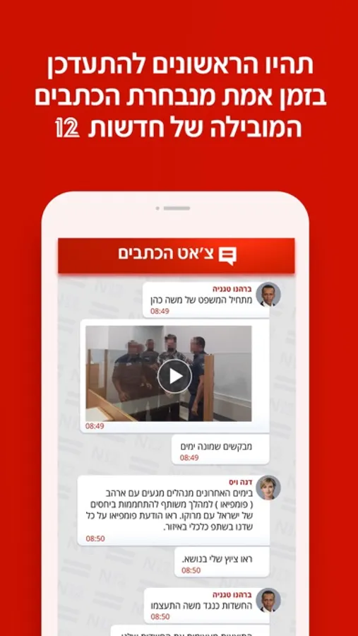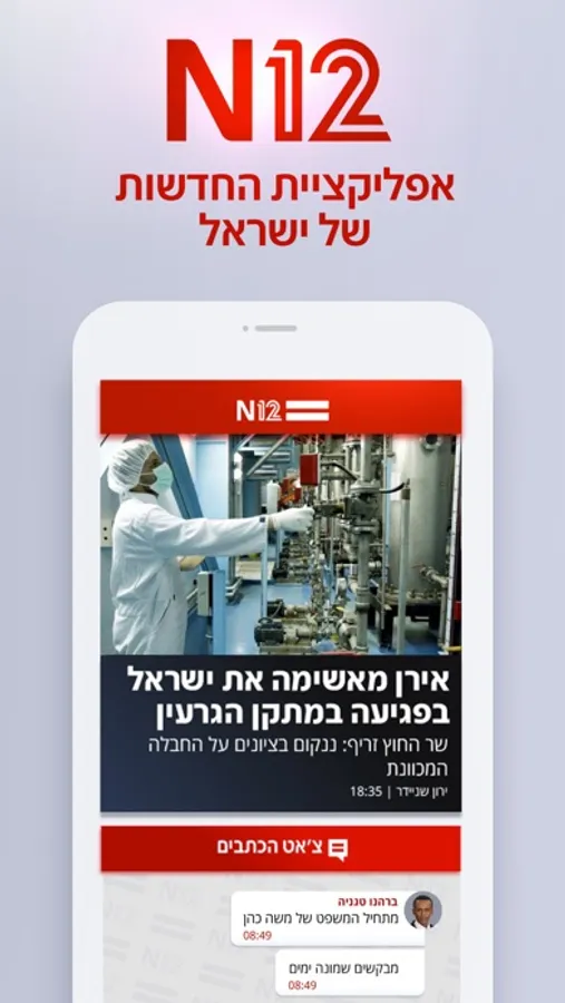 מהיום נבחרת הכתבים שכולכם מכירים, עובדת בשבילכם 24/7 ומאפשרת לכם גישה מהירה ונוחה לעדכונים בזמן אמת באמצעות מבזקים בצ'אט הכתבים. הרכיב הייחודי מוצע למורידי אפליקציית N12 ומציג צ'אט ובו נבחרת החדשות המובילה בישראל ומיטב כתבי חברת החדשות הידועים והמוכרים מחדשות 12, מעדכנים במשך כל שעות היום בזמן אמת במבזקי חדשות מהארץ ומחו"ל.