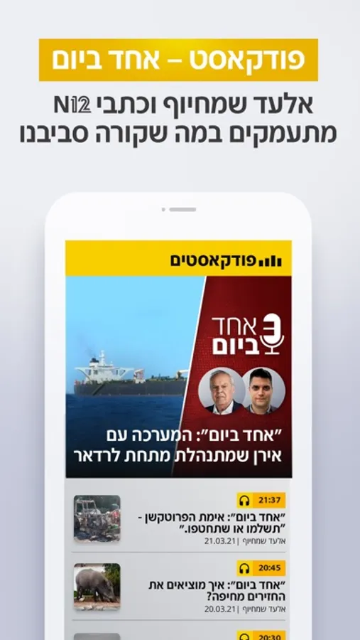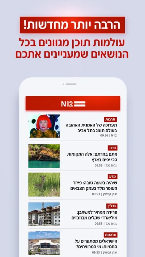 זה הזמן להתקדם ל-N12. חוויית צריכת חדשות שלא הכרתם. מהיום תהיו הראשונים להתעדכן בכל הדיווחים והפרשנויות ותתעדכנו ישירות מנבחרת הכתבים המובילה של חדשות 12.