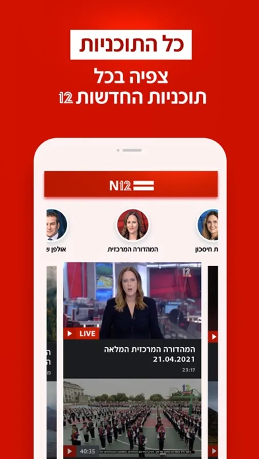 באפליקציית N12 ניתן לצפות בכל זמן בכל התוכניות של חדשות 12: המהדורה המרכזית, אולפן שישי, חדשות סוף השבוע, שישי בחמש עם גדעון אוקו, מבזקי חדשות, תוכנית חיסכון, פגוש את העיתונות עם רינה מצליח, סדר עולמי עם ערד ניר, מהדורה ראשונה עם אורן וייגנפלד, שש עם עודד בן עמי, חמש עם רפי רשף, שלוש עם עופר חדד, המהדורה הצעירה והשבוע בערבית. כמו כן, ניתן לצפות בקטעים ספציפיים מתוך המהדורה המרכזית באמצעות סרטונים קצרים שיצרנו עבורכם על מנת שתוכלו לצרוך את החדשות שמעניינות אתכם בצורה היעילה ביותר.