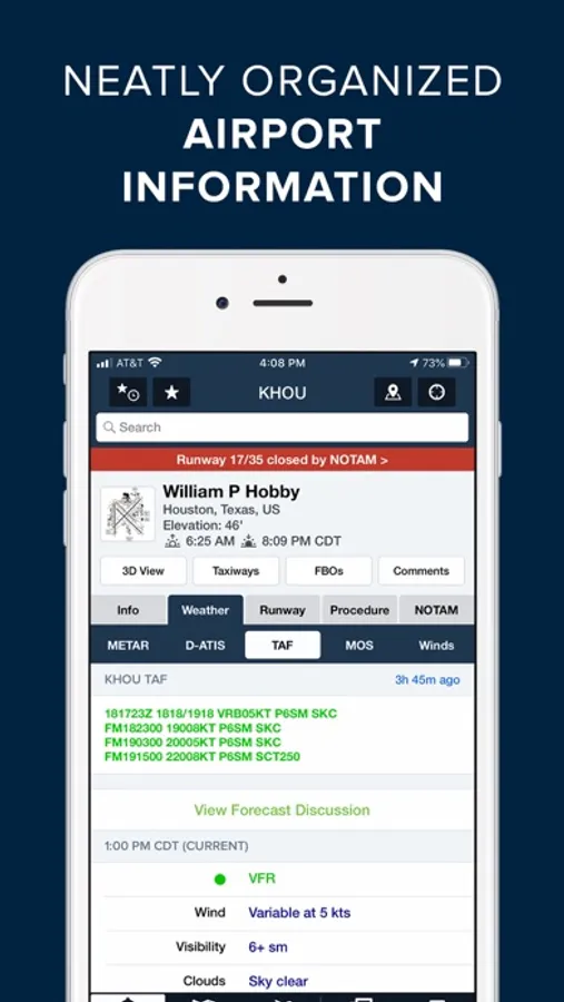 Interactive weather layers include animated radar, global satellite and winds aloft, global icing, turbulence, and surface analysis, graphical AIR/SIGMETs, flight category, visibility, and more. View decoded METARs, TAFs, and MOS forecasts. Thoughtfully organized Imagery view puts a full range of forecast tools at your fingertips.