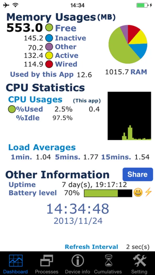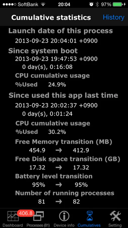 - Cumulative CPU usage and Free memory transition since you used this app last time.