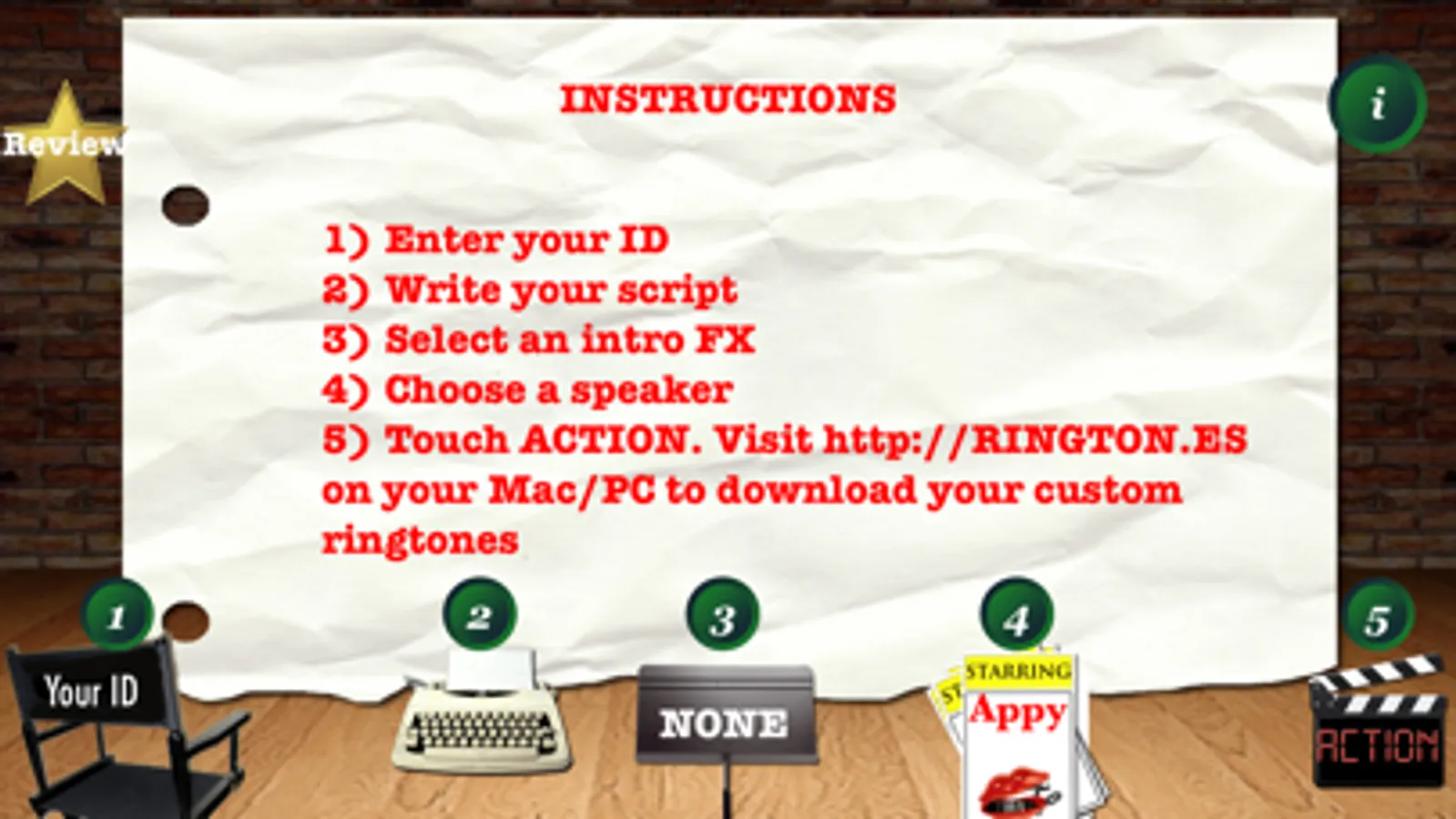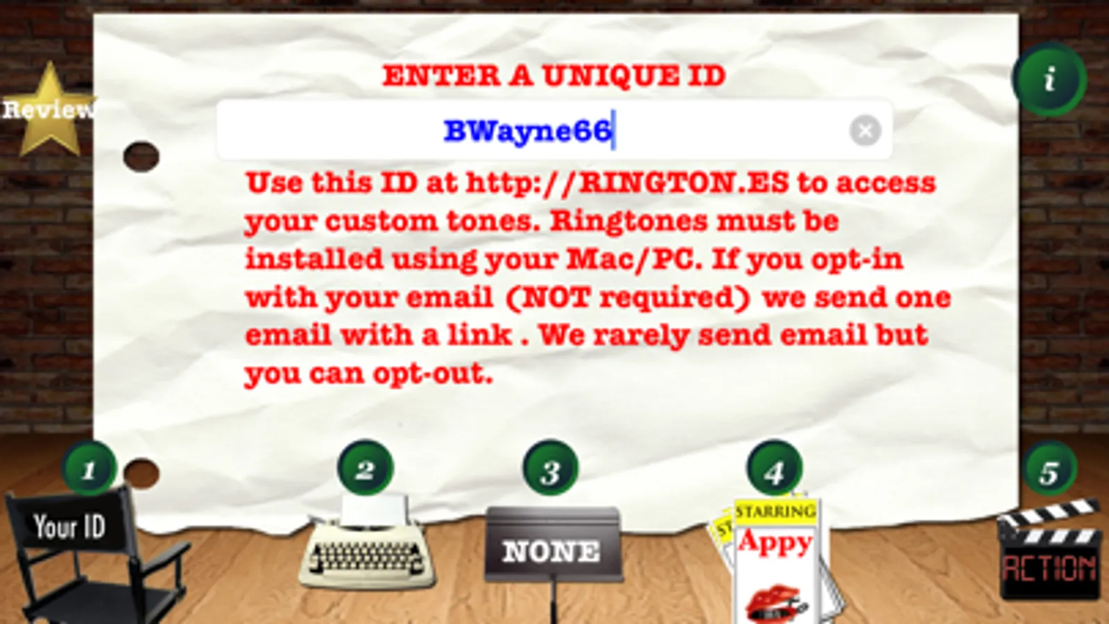 Type a unique ID (email address recommended but NOT REQUIRED), your name or greeting, a caller's name or title, select an optional Intro FX and a speaking voice. PRO also has a MANUAL mode so you can type ANYTHING and have it spoken! Our server (Internet required) builds your custom ringtone and stores it so you can share your ringtones with friends! Ringtones are in BOTH iPhone .m4r and MP3 formats so you can use your ringtones on other phones! Retrieve ringtones at http://RINGTON.ES by logging in with the same ID you entered in the app! This way, you can select which custom ringtones you like, and you don't have to worry about getting 100's of emails going to your spam folder! Remember, NO APP is allowed to install ringtones. They must be downloaded and opened in iTunes, per Apple.