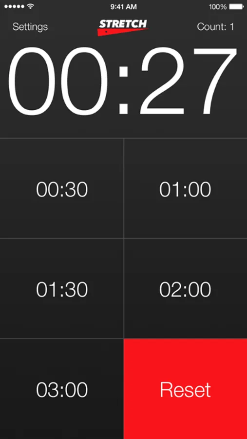 Stretch - A continuous period of time. Stretch is a count down timer. It's designed to be to as simple as possible. It comes with five large buttons, each of which starts a preset count down timer, and a large reset button to stop the count down should you wish. It also keeps a count of how many times the count down has been run.