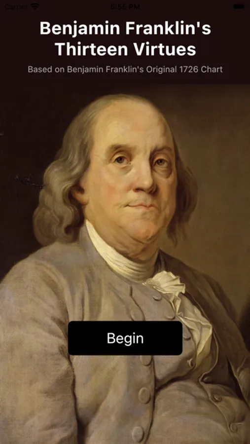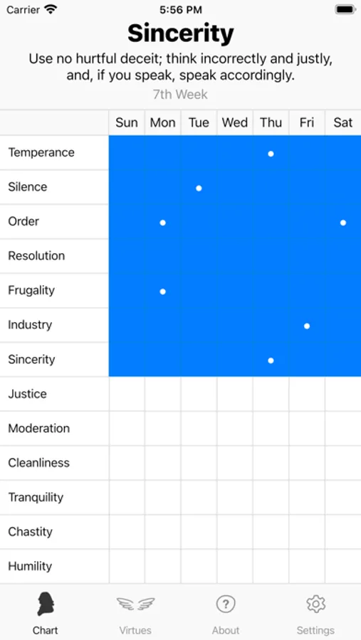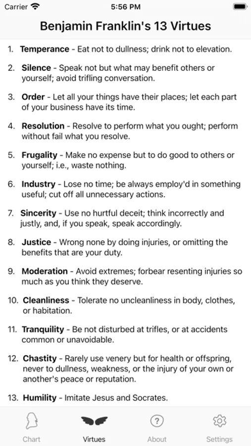 Use this modern incarnation of Benjamin Franklin’s original chart to improve and regulate your daily conduct. Every evening review your day. Tap the day's date to place a mark if you transgressed the week's virtue. One virtue is highlighted every week and the whole chart should be completed four times in a year. The goal is to live your days - giving strict attention to each virtue - without having to place any marks on your chart.