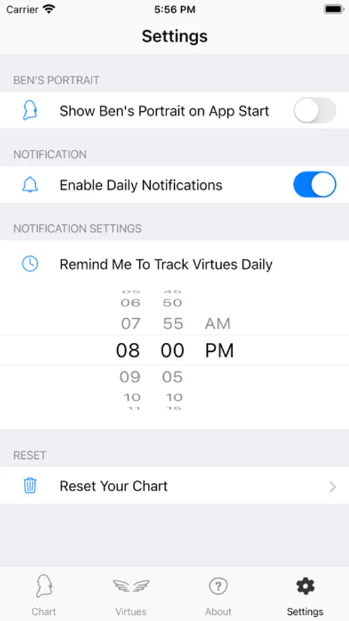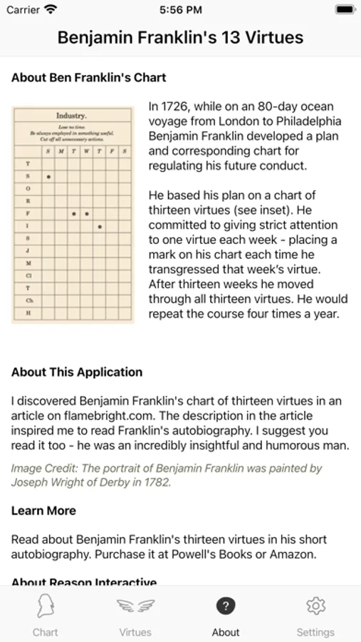 Thank you for checking out Ben's Virtues. If you like the app please leave a review. If you have any issues or suggestions contact us at support@reasoninteractive.com for a quick response.