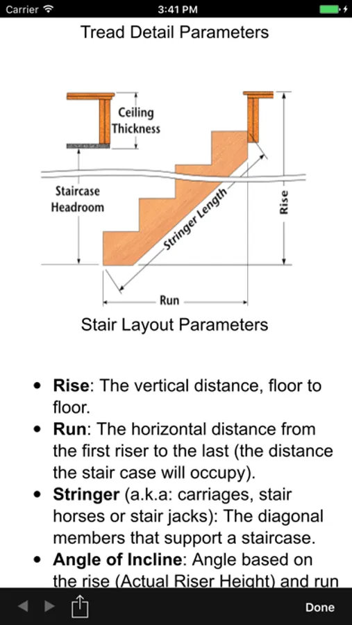 • Advanced Stair function: Stair layouts for professional results - including dimensioned drawings of your Stringer, Stringer Installation, and Finished Staircase. And you can email a PDF of these drawings right from BuildCalc so you can print them or share them.