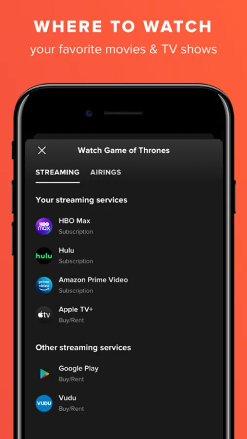 QUICK WATCH: One-tap links to the best service (subscription, buy, or rent) to watch a show or movie, based on price, popularity, and your personal streaming subscriptions and live TV provider.