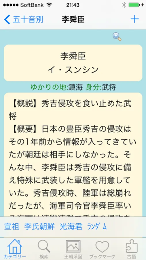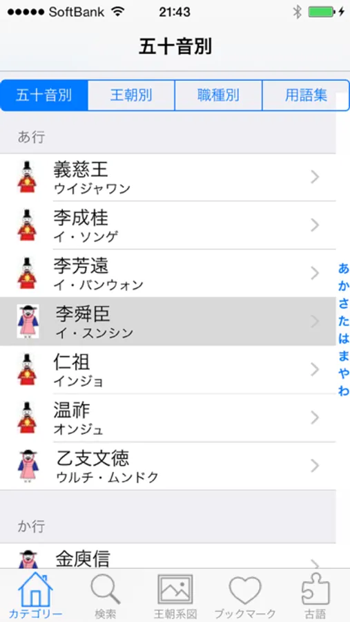五十音別、王朝別、役割別の人物検索、韓国独特の歴史用語の検索が可能です。