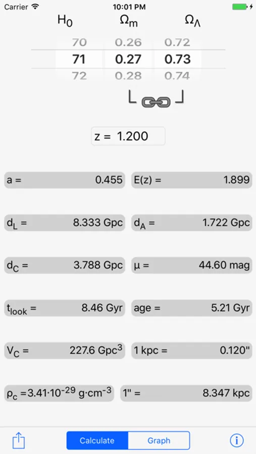 * Quickly determine the luminosity distance, angular diameter distance, lookback time, age of the Universe, comoving volume, and critical density