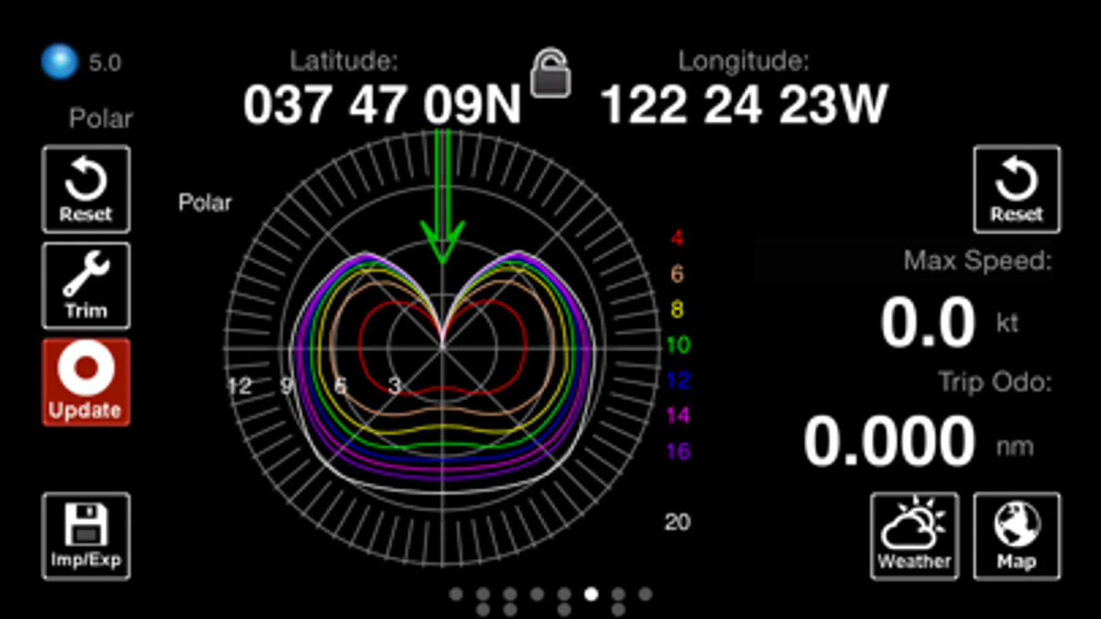View your current position and trip odometer and max speed since last reset. You'll also see a polar diagram with your speed and VMG (wind speed dependent).