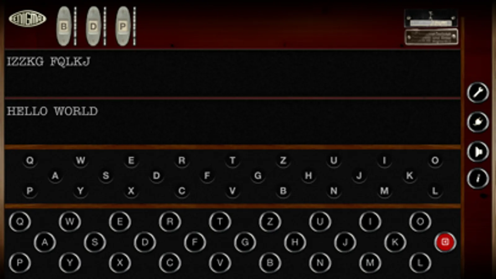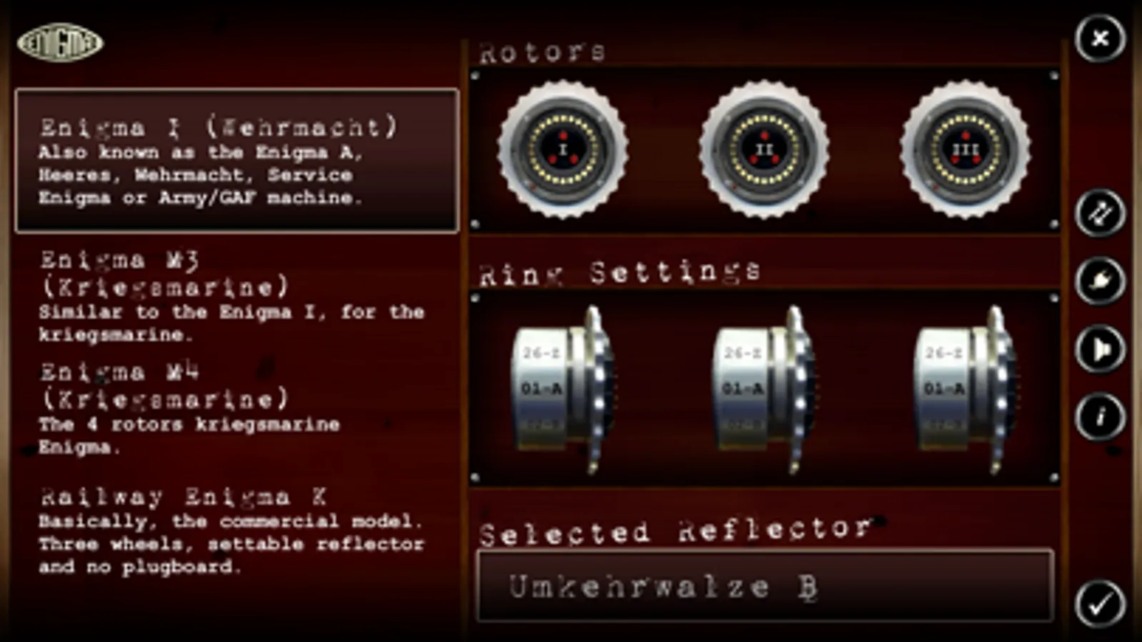 You can actually select between the different machine types and setup them as you would with a real one: choose rotors, configure them, or use a plugboard to switch letters. All at the tip of your finger.