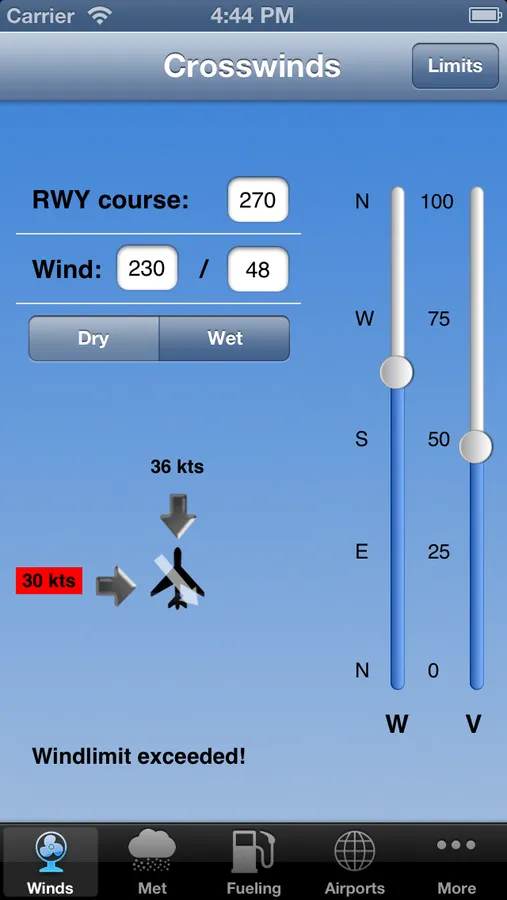 Now you may change winddirection and -speed by simply moving 2 sliders. This way you can very quickly determine how much stronger the wind may get or how far it may turn to exceed your limits. Once a limit is exceeded, a warning appeares and the reading turns red.
