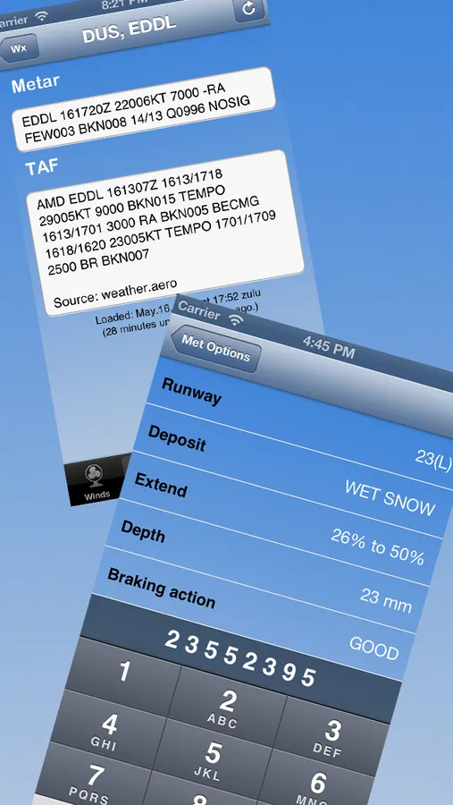 Look up over 9000 airports from all over the world. Convenient handover of that airport to the big sister app "Airports Plus", if installed.