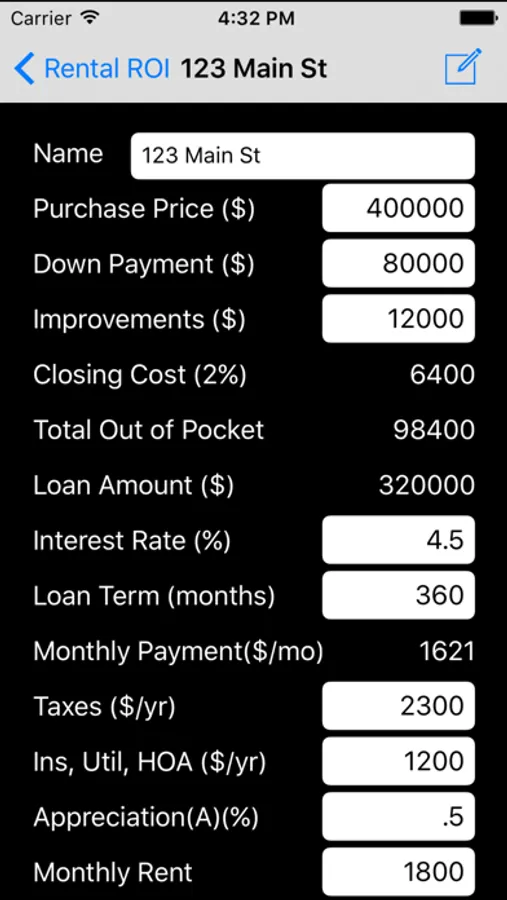 Rental ROI Plus will automatically calculate: Closing Cost, Total Out of Pocket, Loan Amount, Monthly Mortgage Payment, Annual Cash Flow, Cash In, Cash Out, Cash Net, Cash ROI, Cash plus Equity plus Appreciation ROI, Property Value, Accumulated Equity, Return If Sold, and Annualized ROI If Sold for a given year.