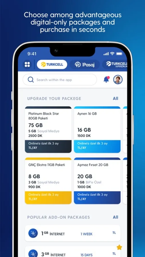 With Turkcell app, you can monitor your usage, view and pay your invoices, top-up your account, purchase packages, shop for electronics and much more with ease, speed and free of charge. You can easily switch between Turkcell and Turkcell Pasaj on the renewed interface. Through the app, you can find the opportunity to access our special promotions, reminders and offers. It is time to discover the privilege of shopping for many technological products through Turkcell app with Turkcell Pasaj!