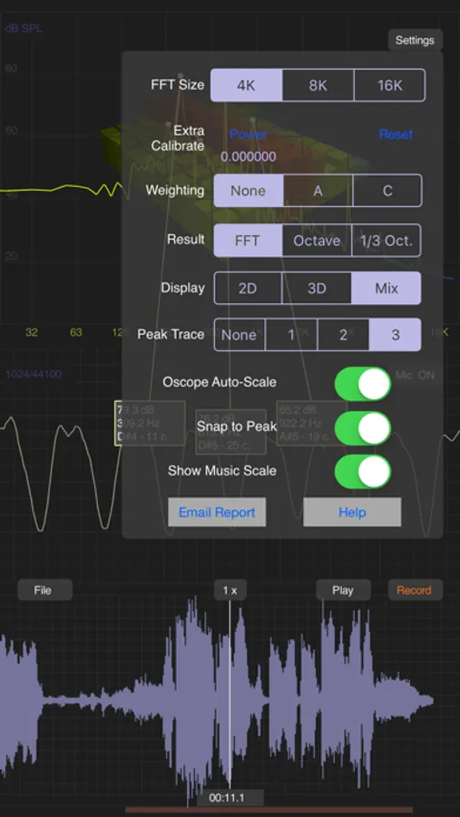 -Move in the waveform area or touch on the bottom of the area to change the current position, iAnalyzer re-compute and update graph automatically. You can also change the position while playing.
