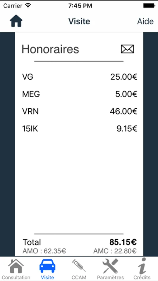 - Présentation de la note d’honoraires avec les différents codes, leur tarif respectif et les parts AMO/AMC (régime général ou Alsace-Moselle). Envoi de la note par mail à une adresse paramétrable par défaut pour comptabiliser les actes de retour au cabinet.