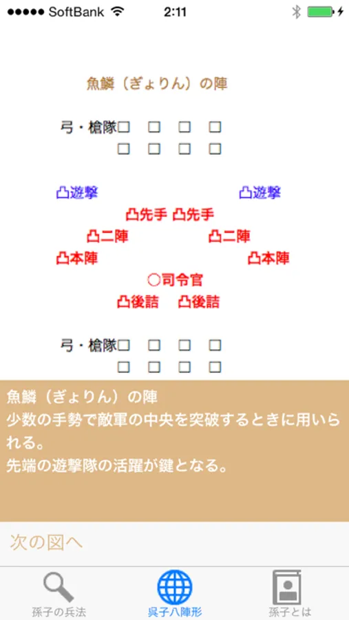 孫子の「計篇、作戦篇、謀攻篇、形篇、勢篇、虚実篇、軍争篇、九地篇、火攻篇」にそってセレクトできます。