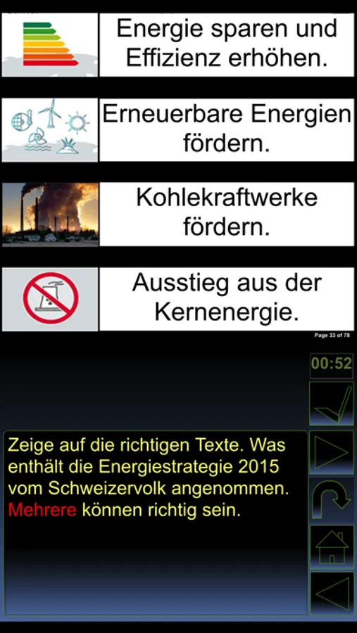 Bei den meisten Aufgaben musst du handlungsorientiert Schilder an die entsprechenden Stellen schieben oder Puzzle Teile verschieben. Multiple Choice Fragen gibt es nur wenige.