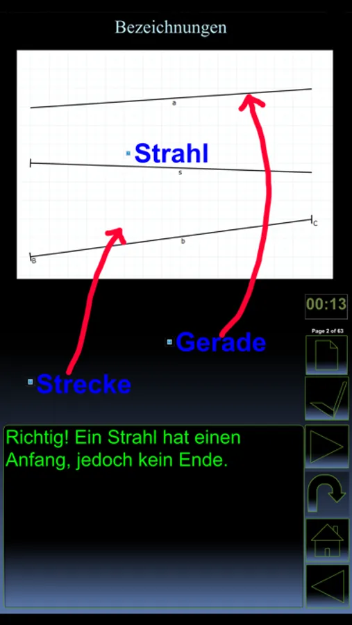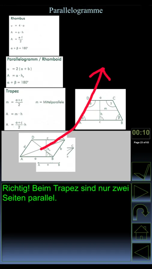 Grundbegriffe der Geometrie von der Strecke bis Pythagoras gemäss Lehrbüchern und Lehrplänen der Schweiz. Komplizierte Sachverhalte werden durch Animationen veranschaulicht und erklärt. Formeln und Begriffe werden geübt. Zu jeder Aufgabe hat es entsprechende Abbildungen. Meist muss die richtige Lösung auf einem Bild mit dem Finger gezeigt werden oder Schilder und Abbildungen werden handlungsorientiert an die richtige Stelle geschoben. Am Schluss gibt es eine Punkteauswertung. Im Probiermodus kann man korrigieren, es hat eine Spicktaste und die Seite kann einmal wiederholt werden. Im Testmodus gibt es eine Punkteauswertung. Die App wurde in der Version 2 komplett neu überarbeitet.