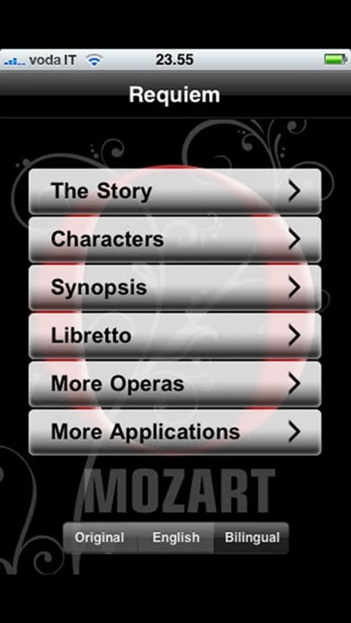 The application includes the opera libretto (in an original language, English or bilingual version), some information about how the opera came to be, a plot summary and the list of characters.