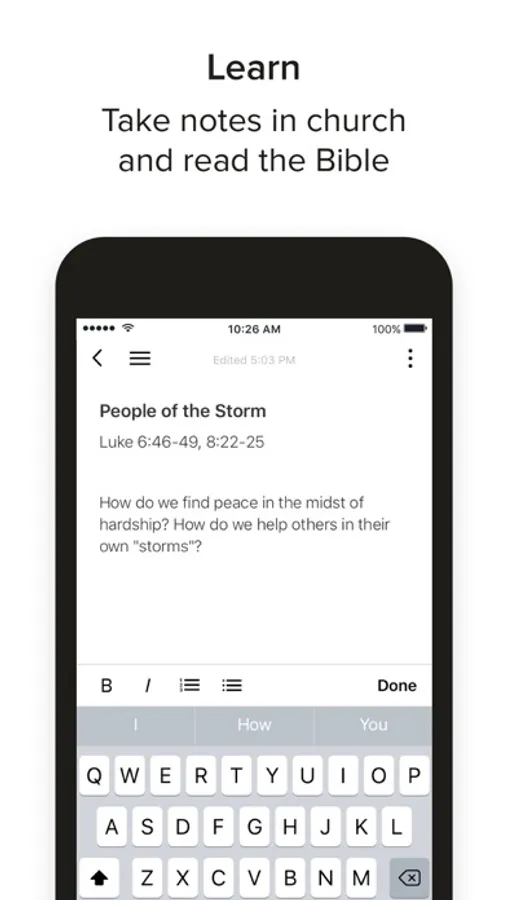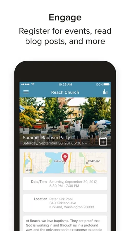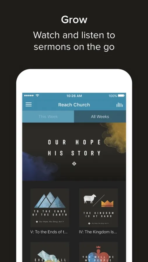 Connect to your church and get the latest sermons, resources, updates, and more delivered right to your mobile device. With The Church App, you can easily watch and listen to sermons on-the-go, download media for offline listening, find and register for events, read blog articles, read the Bible, donate to your ministry, take notes in church, and much more.