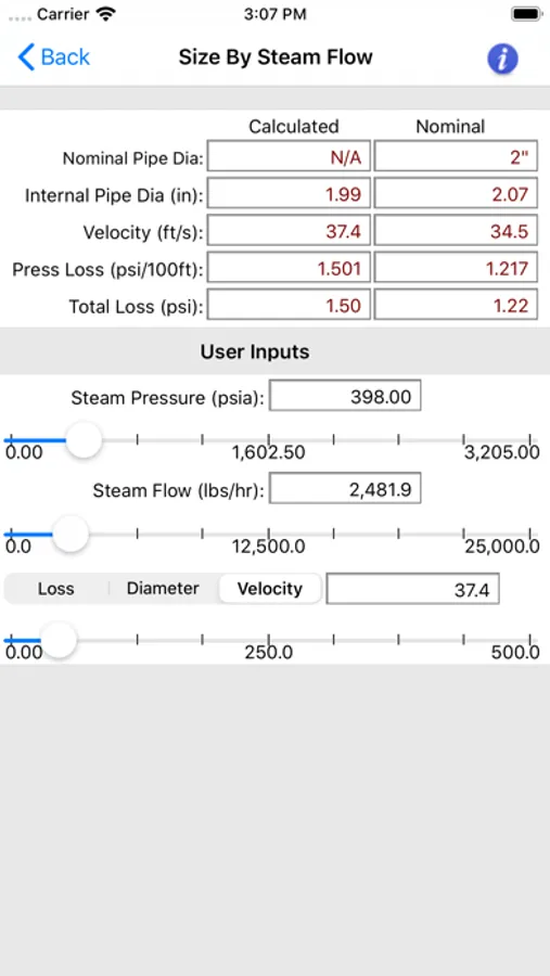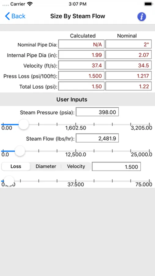 In the pipe sizing module, you can specify the total steam flow in lbs/hr (or kgs/hr), the initial steam pressure (psia or psig) and one of either pressure loss (psi/100ft), pipe internal diameter (inches) or steam velocity (ft/s) parameters. The results include both the exact and nominal pipe diameters and the calculated velocity and total pressure loss. If you are analyzing an existing steam pipe system, there is an option to input the existing pipe internal diameter, initial steam pressure and one of either pressure loss or steam velocity parameters to derive the calculated steam flow and other remaining properties.