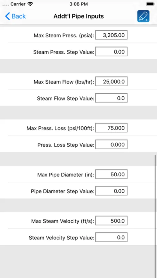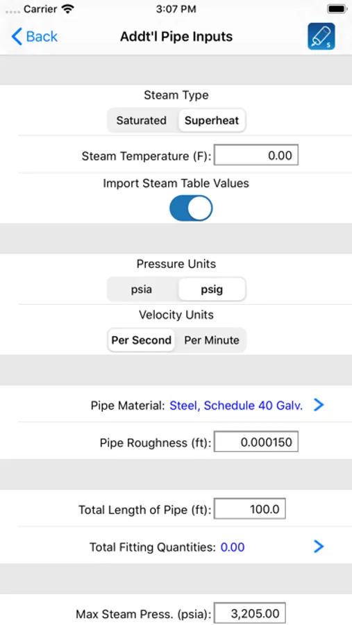 You can specify additional parameters such as whether the steam is saturated or superheated (with accompanying temperature), the pipe material type, the total length of pipe, quantities for up to 11 different types of pipe fittings, and much more. You can also choose to display values in either english or metric units.