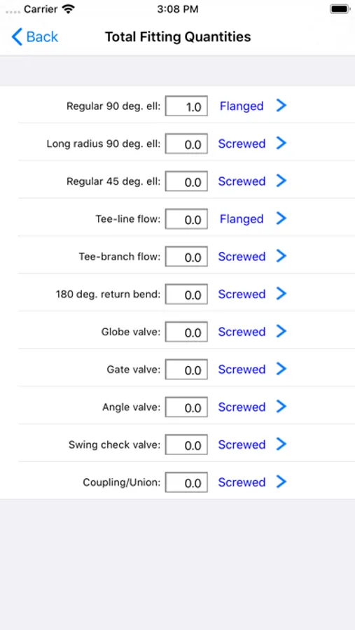 This application includes built-in pipe fitting equivalent length and nominal pipe sizing tables for a wide variety of pipe material types and diameters.