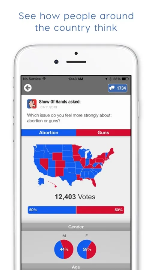 Show of Hands is a smart and fun community polling platform for people who love to ask questions and learn how other people think! As one of the oldest apps on the App Store, now in our 14th year, we have a loyal community of opinionated users who debate with each other daily on just about any topic you can imagine. You can answer new questions daily and see instant, real-time, anonymous results from fellow brilliant minds around the country. This information is broken down by age, religion, income, political party, gender, and more! (You can just think of us as your national level town hall.)