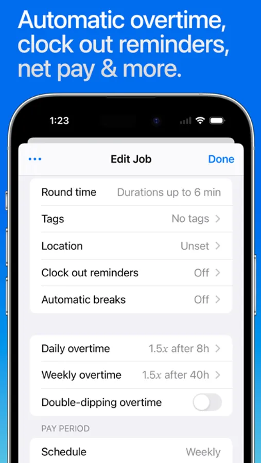 • Set job locations to get clock in and out reminders when you arrive or leave or fully automate your time tracking (geofencing)