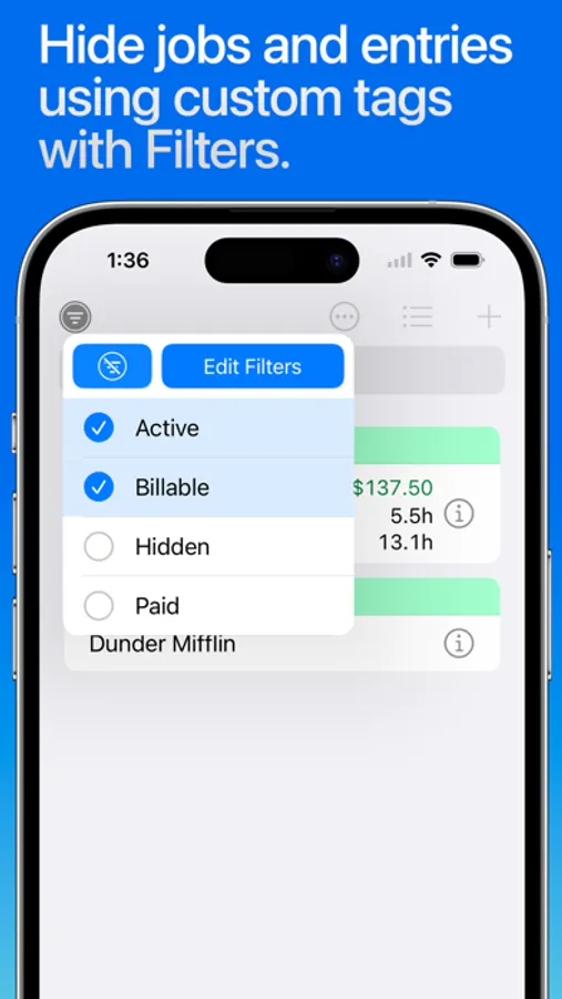 • Customize your HoursTracker experience in the Preferences section under the More tab. Choose only one or many jobs clocked in at a time, opt-into prompts for comments, choose an elapsed time format (hours:minutes, or decimal hours), and more